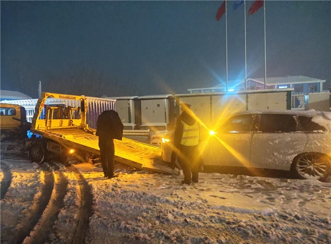 安抚好司乘情绪后,工作人员立即着手处置故障车辆。为避免车道拥堵、保障通行安全,大家合力将故障车辆缓慢推至站区外广场安全区域停放,消除道路通行隐患。同时,收费班长凭借丰富的应急处置经验,快速为司乘联系专业道路救援车辆,详细告知故障车辆位置、车型及故障情况,协调救援人员尽快赶赴现场。等待救援期间,工作人员始终陪伴在司乘身边,实时告知救援进度,普及暴雪天气行车安全注意事项,贴心的服务让身处异乡的司乘倍感温暖。